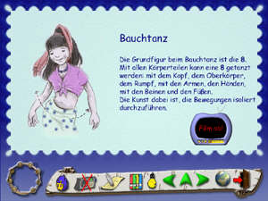 Die Inhaltsseiten Nach Auswahl des Themas kommt man auf die eigentliche Inhaltsseite (hier: Bauchtanz), die sich grafisch von den Auswahlseiten abgrenzt. Auf den Inhaltsseiten stehen kurze Texte, die durch verschieden Medien ergänzt werden (hier: Video). Dabei wird großen Wert auf eine ganzheitliche Behandlung des Themas gelegt. |