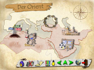 Hauptmenü Orient Auf dieser Seite begegnet der Professor seiner Begleiterin für den Orient (Animation). Am Ende der Animation erscheint das Hauptmenü Orient. Der Benutzer kann in diesem Menü den Bereich auswählen, für den er sich interessiert.