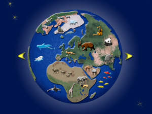 Die Kulturregionenauswahl Durch Anklicken des Globus kommt der Benutzer zur eigentlichen Kulturregionenauswahl. Dazu steht ihm eine Weltkugel zur Verfügung, welche um 360° drehbar ist. Der Weltatlas ist als CD-Serie geplant, wobei zu jeder Kulturregion eine eigene CD vorhanden ist. Auf der Weltkugel sind nur die Regionen klickaktiv, für die CD´s installiert sind (hier: Orient). Durch Anklicken der sensitiven Bereiche landet man in der gewünschten Region. |